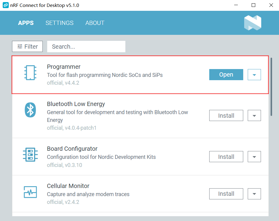 打开软件nRF-Connect-for-Desktop 安装工具 Programmer 并打开